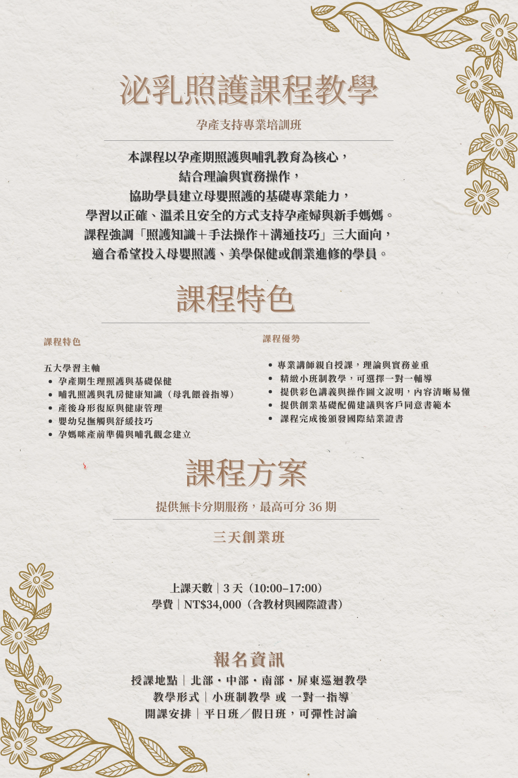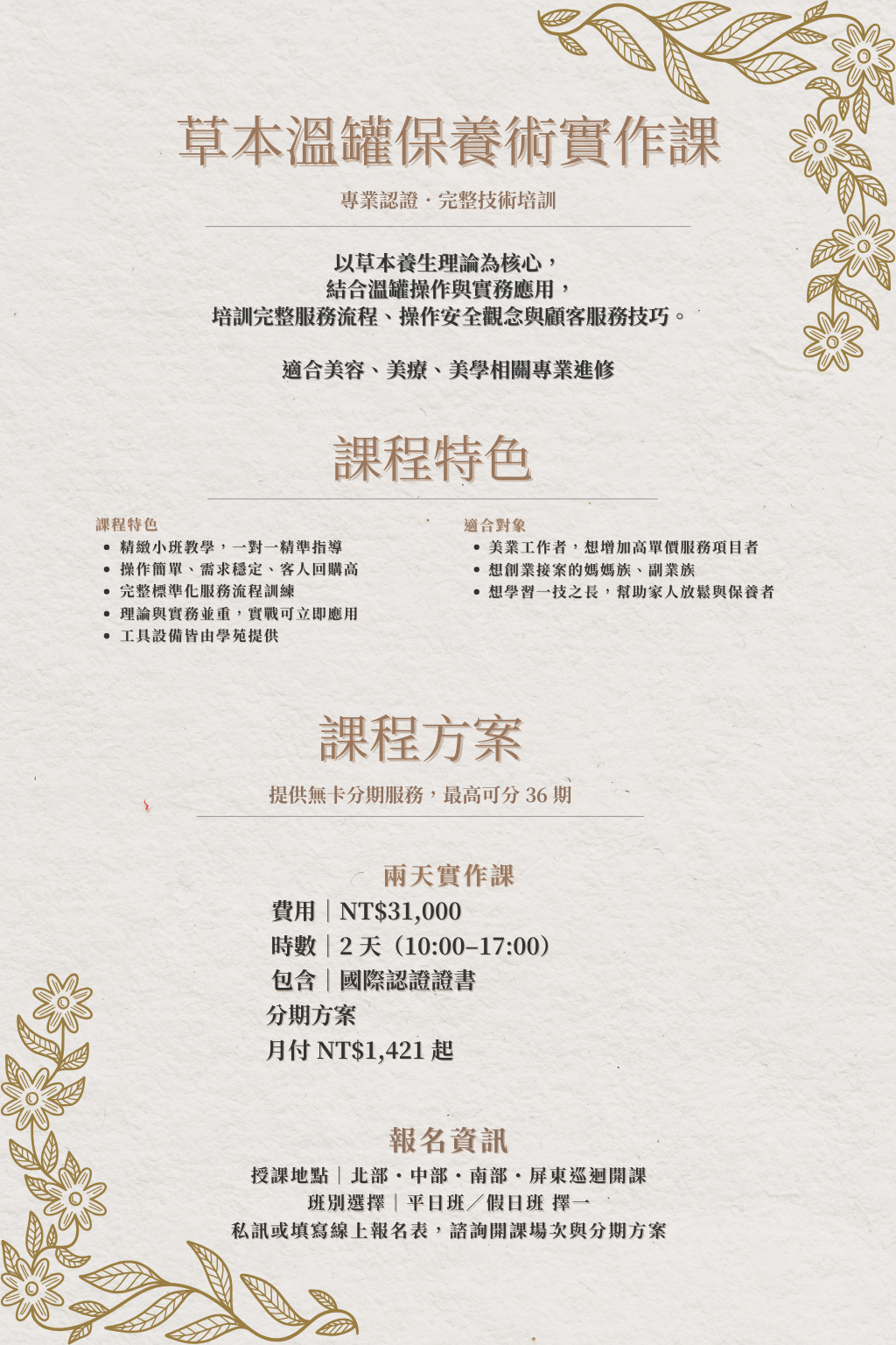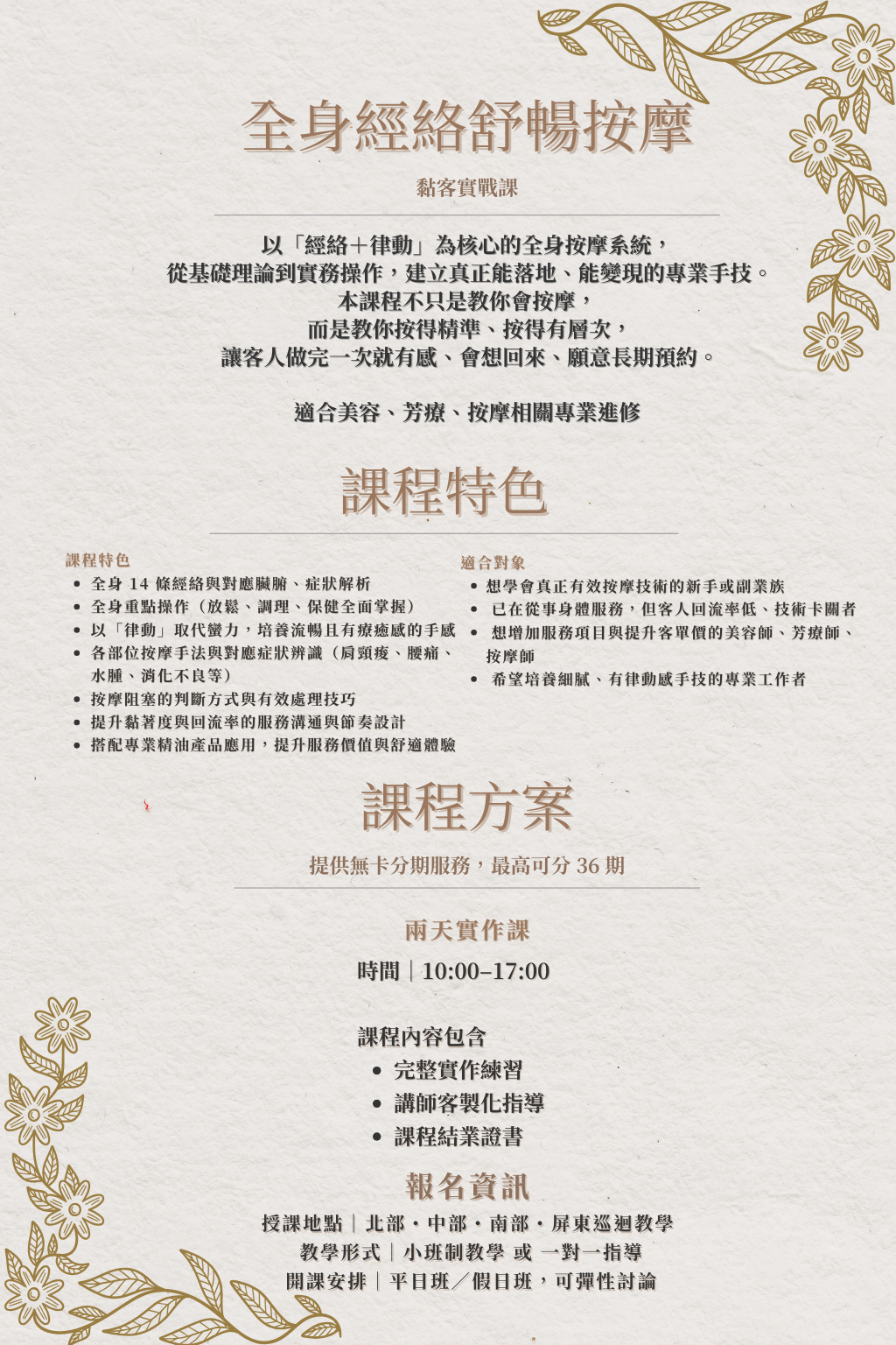 涵蓋美容、美體、養生、泌乳與身心靈療癒。